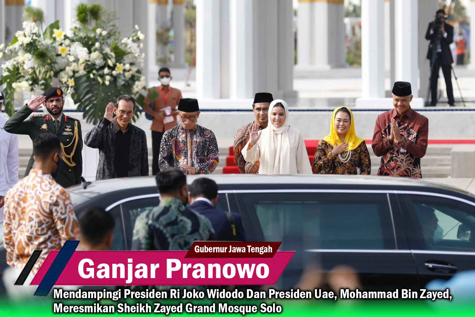 Solo, “tabloidnusantara.com” – Gubernur Jawa Tengah Ganjar Pranowo mendampingi Presiden RI Joko Widodo dan Presiden UAE, Mohammad bin Zayed, meresmikan Masjid Sheikh Zayed Grand Mosque Solo, Senin (14/11/2022). Mengenakan baju batik dan berpeci hitam, Ganjar nampak berada dalam rombongan tamu-tamu kehormatan saat peresmian berlangsung.