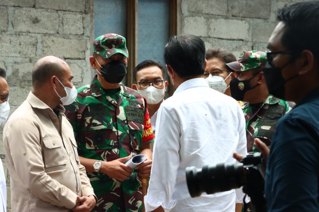 Didampingi Pangdam IX/Udayana Mayjen TNI Sonny Apriyanto, S.E., M.M., di lokasi peninjauan, Kepala Negara menyimak penjelasan panel yang disampaikan oleh Wakil Asisten Logistik Kasdam IX/Udayana Letkol Kav Djefri Marsono Hanok.