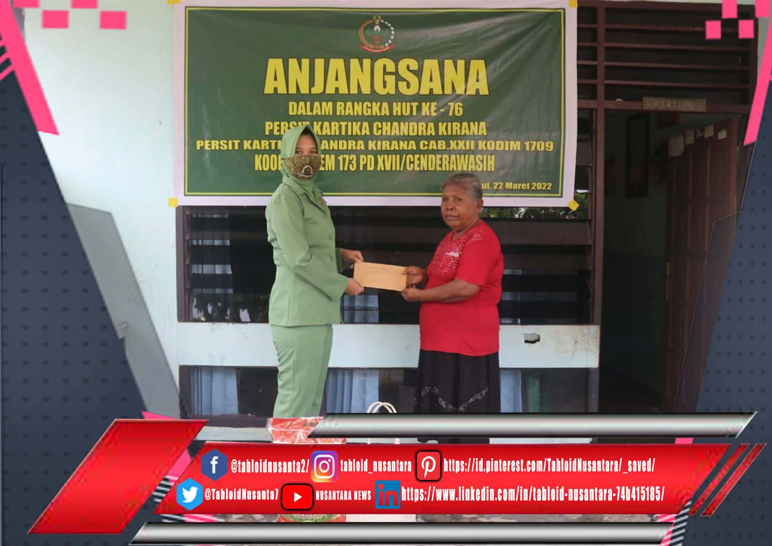 YAPEN, “TABLOIDNUSANTARA.COM” – Dalam rangka menyambut Peringatan Hari Ulang Tahun Persit (Persatuan Istri Tentara) ke-76 Tahun 2022, Persit Kartika Chandra Kirana Cabang XXII Kodim 1709, menggelar Anjangsana sekaligus memberikan Bantuan Sembako kepada Panti Asuhan dan Warakawuri di wilayah Kodim 1709/Yawa Kab. Kep. Yapen, Rabu (23/03/2022).