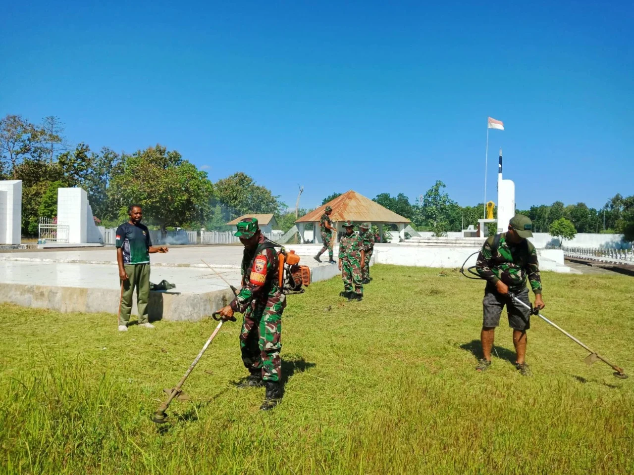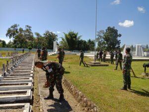Belu, “TABLOIDNUSANTARA” – Dalam rangka menyambut HUT ke-65 Kodam IX/Udayana, personel gabungan TNI dari Kodim 1605/Belu, Yonif RK 744/SYB dan Kikav KKA melaksanakan kegiatan Karya Bhakti pembersihan Taman Makam Pahlawan (TMP) Seroja Haliwen, pada Senin (23/5/2022).
