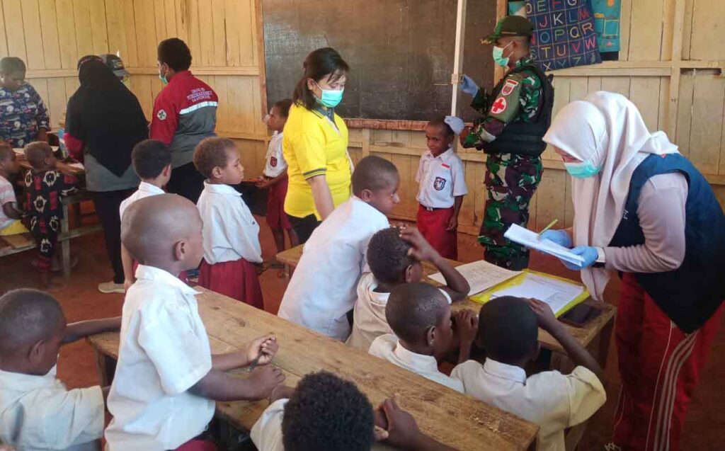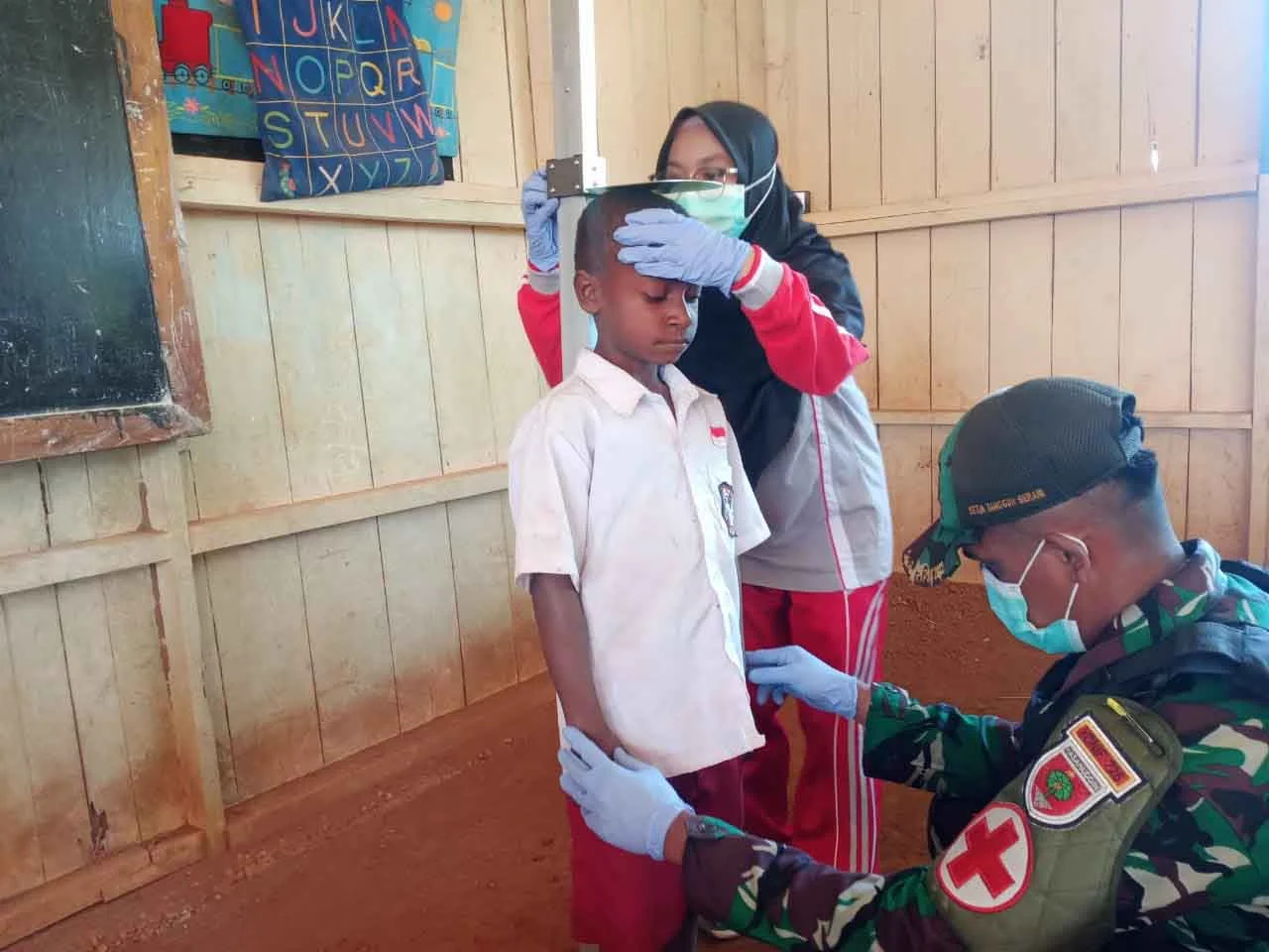 BOVEN DIGOEL, “tabloidnusantara.com” – Meningkatkan status perkembangan Gizi serta kesehatan anak-anak wilayah perbatasan RI-PNG, Satgas Pamtas Yonif 725/Woroagi yang di bawah naungan Korem 174/ATW Pos Kombut bekerjasama dengan Puskesmas Kombut memberikan layanan kesehatan mulai dari mengecek kesehatan anak-anak, mengukur tinggi dan berat badan anak-anak serta setiap anak diberikan obat cacing di SD. YPPK. ST. Yohanes Kombut Kampung Kombut, Distrik Kombut, Kabupaten Boven Digoel, Rabu (01/03/2023).