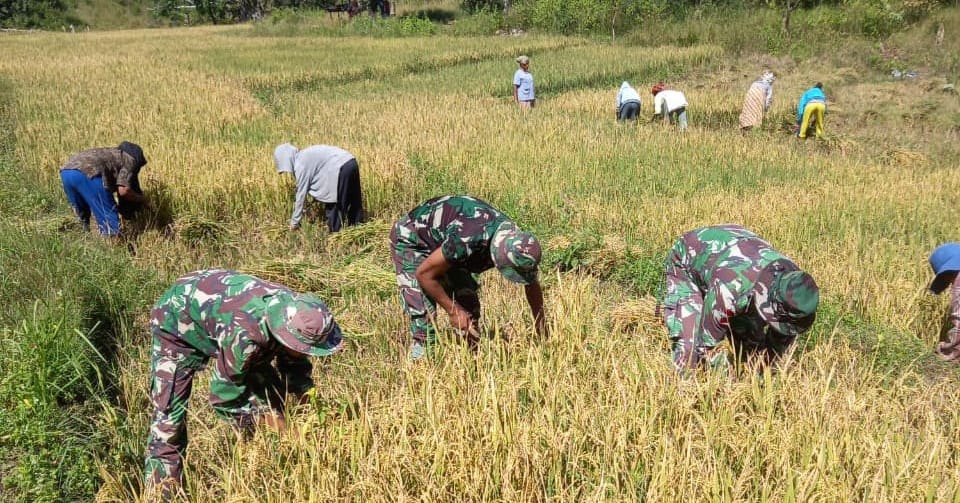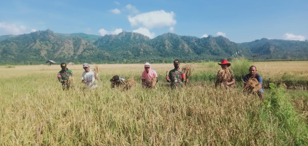 Belu, “TABLOIDNUSANTARA” – Guna mendukung ketahanan pangan masyarakat di Perbatasan, Prajurit Satgas Pamtas RI-RDTL Yonif 743/PSY Pos Nunura melakukan kegiatan panen padi bersama masyarakat di Desa Toge, Kecamatan Raihat, Kabupaten Belu, pada Jumat (6/5/2022).