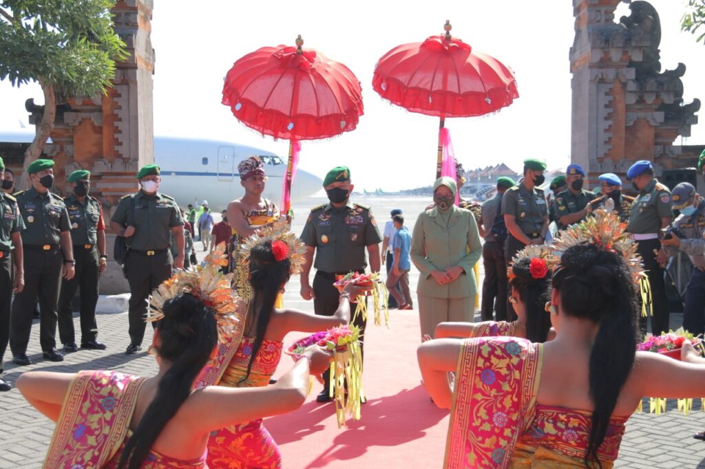 Badung, “TABLOIDNUSANTARA.COM” – Disambut dengan tradisi Tepung Tawar, Kepala Staf Angkatan Darat (Kasad) Jenderal TNI Dudung Abdurachman, S.E., M.M., dan Ketua Umum Persit KCK Ny. Rahma Dudung Abdurachman beserta rombongan tiba di Base Ops Lanud I Gusti Ngurah Rai, pada Rabu (13/4/2022).