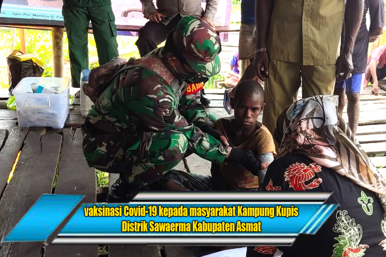 ASMAT, “TABLOIDNUSANTARA.COM” – Bertempat di halaman rumah Kepala Kampung Kupis Bapak Elias Aose Babinsa Koramil 1707-12/Sawaerma Kodim 1707/Merauke Serma Sucipto dan Koptu Zaenal melaksanakan pendampingan membantu petugas kesehatan Puskesmas Sawaerma dalam melakukan kegiatan vaksinasi Covid-19 kepada masyarakat Kampung Kupis Distrik Sawaerma Kabupaten Asmat – Papua.