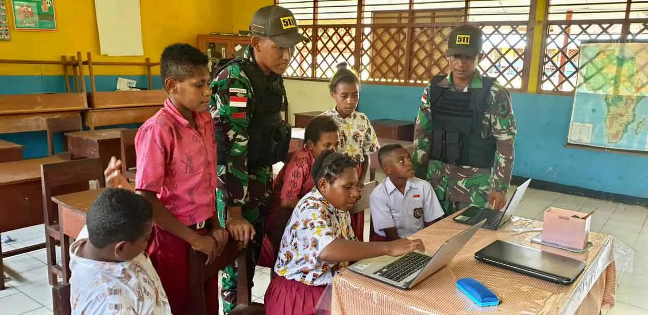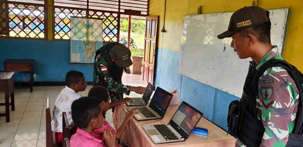 MERAUKE, “tabloidnusantara.com” – Untuk meningkatkan ilmu pengetahuan dan teknologi kepada anak-anak di perbatasan, Satgas Pamtas RI-PNG Yonif 511/DY Pos Koki Kalimaro SSK 1 yang dipimpin oleh Serda Inal berserta 9 orang personel mengajarkan sejak dini kepada siswa SD Yayasan Pendidikan Kristen (YPK) Tanas tentang cara mengoperasikan Laptop di Kampung Tanas, Distrik Elikobel, Kabupaten Merauke, Sabtu (04/03/2023).
