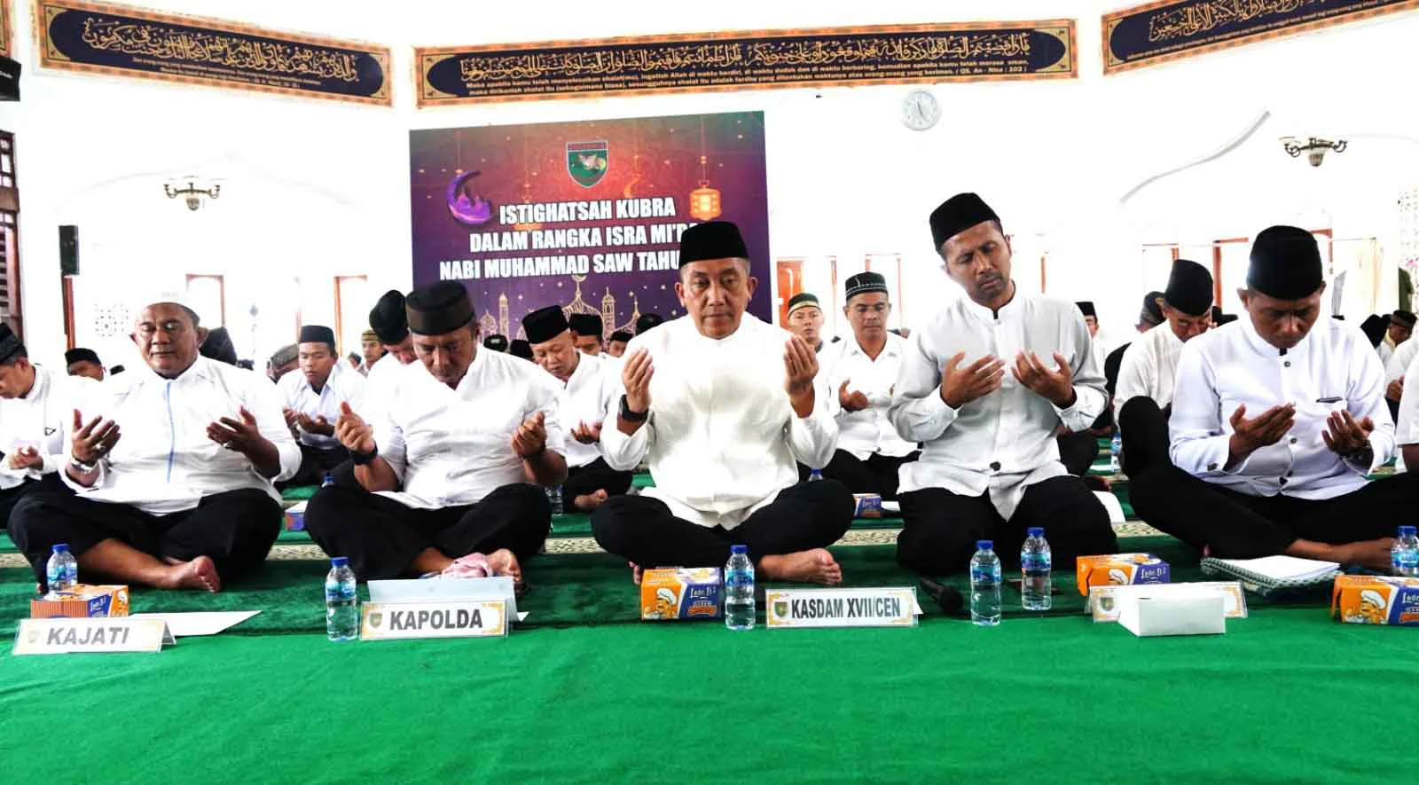 Jayapura, “Tabloid Nusantara” – Kodam XVII/Cenderawasih melaksanakan kegiatan Istighosah Kubra dalam rangka menyambut Isra Mi’raj Nabi Muhammad SAW Tahun 2023 kegiatan yang dipusatkan di Masjid Al-Fajr, Makodam XVII/Cenderawasih, Kota Jayapura secara langsung dan Virtual melibatkan Prajurit TNI Polri, PNS dan masyarakat, Minggu (19/2/2023).