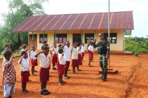 Boven Digoel, “Tabloidnusantara.com” – Personel Satgas Pamtas RI-PNG Yonif 725/Wrg yang berada di bawah naungan Komando Korem 174/ATW, Pos 3/B Kombut memberikan materi Peraturan Baris Berbaris(PBB) dan Wawasan Kebangsaan kepada siswa-siswi Sekolah Dasar, yang dilaksanakan di SD YPPK ST. Yohanes Kombut, Kampung Kombut, Distrik Kombut, Kab. Boven Digoel, Jumat (04/11/2022).